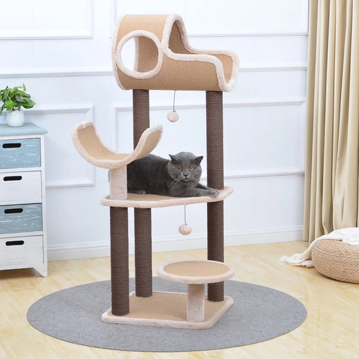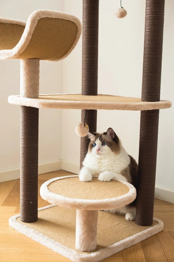 The Camel is a beige carpeted 5-level cat tree, features 5 non-toxic recycled paper rope scratching posts, one cradle perch and top unique cradle tunnel condo. Your kitty will enjoy jumping from perch to perch and playing with the two pom pom toys. The neutral beige color with cream edging will suit any room in your home.