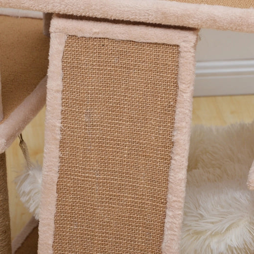 The Castle is exactly how it sounds, a grand cat castle for one or more cats. In a light beige and cream color scheme it will blend perfectly in any home. Featuring 8 levels of playing, lounging and scratching. It includes 1 lower faux fur shag hammock, a soft side hammock, two soft condos with faux fur shag cushions, three faux fur shag beds, a natural jute scratching board ramp, and 8 natural jute scratching posts. It even has a 100% natural sisal rope toy and three pom toys. Your cat will be living in luxury in this tower.