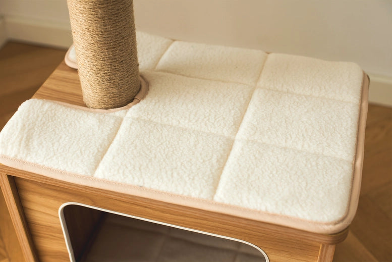 The Cedar natural cat tree condo is sleek and great for your cat to nap in. Composed of laminated wood, a 100% natural jute scratching post, and cozy white fleece cushions. You can remove all the cushions to easily wash, and the great thing about wood is fur wont stick. Your cat will enjoy hiding in the condo, scratching the post and jumping up on the perch bed for a nap. This clean modern design will fit in any room of your home and still look stylish.