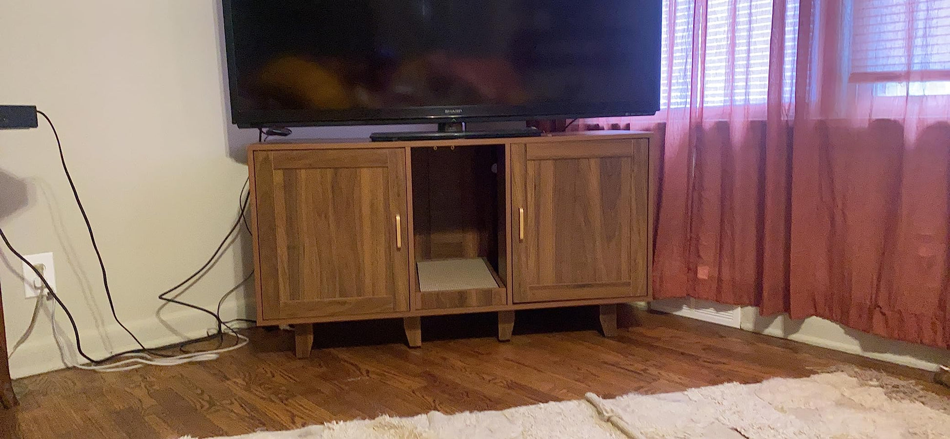 2-Door Cat Litter Box Enclosure TV Stand with Winding Entry & Scratching Board- Model #16537429