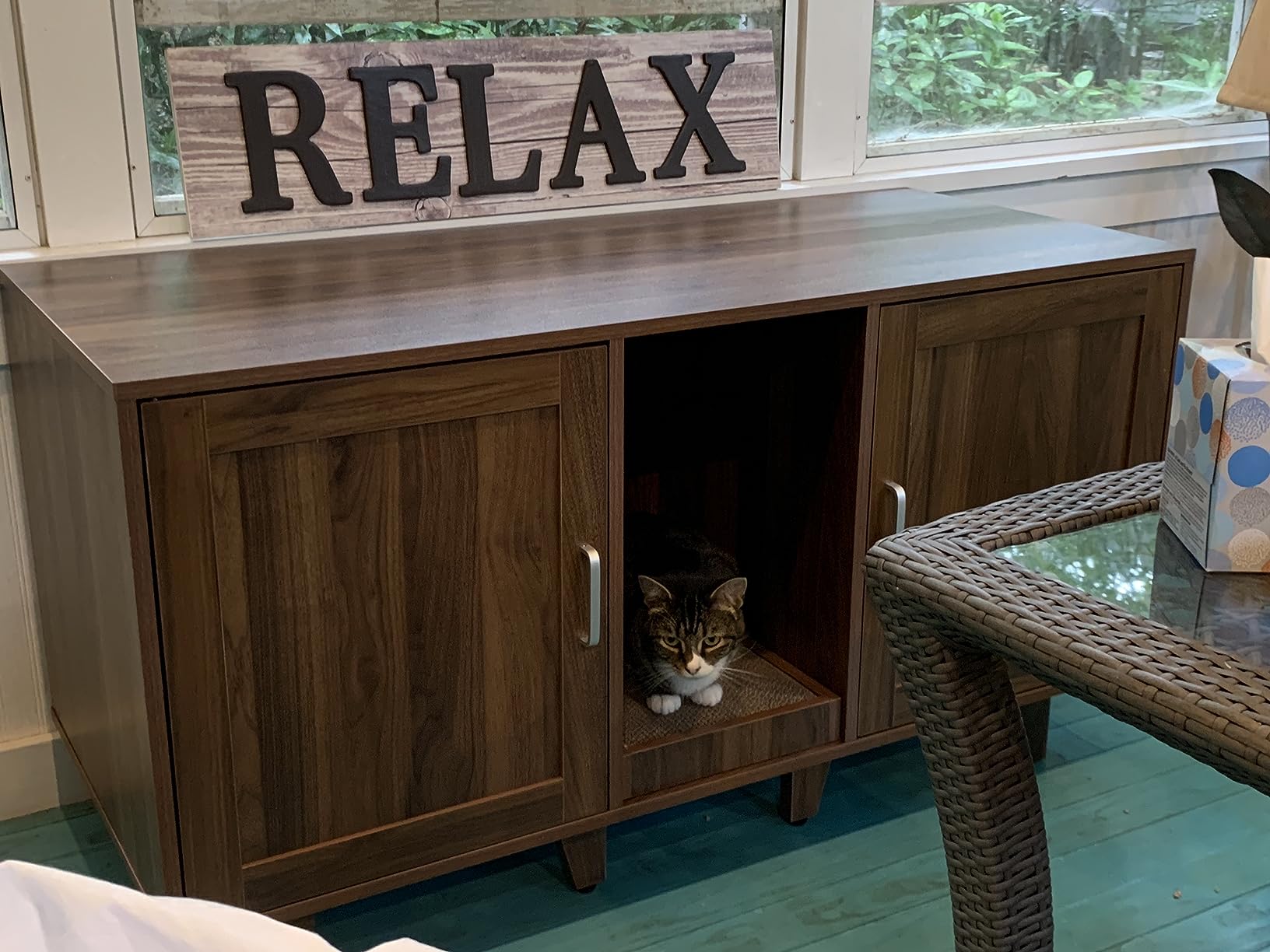 Scratching Board and Cat-Friendly Entry: This hidden cat washroom comes with a removable cat scratching board, which offers a place for cats to grind paws and protects your furniture from claw damage. What's more, the 3-sided entry allows cats to easily go in and out, while satisfying their desire for exploration.