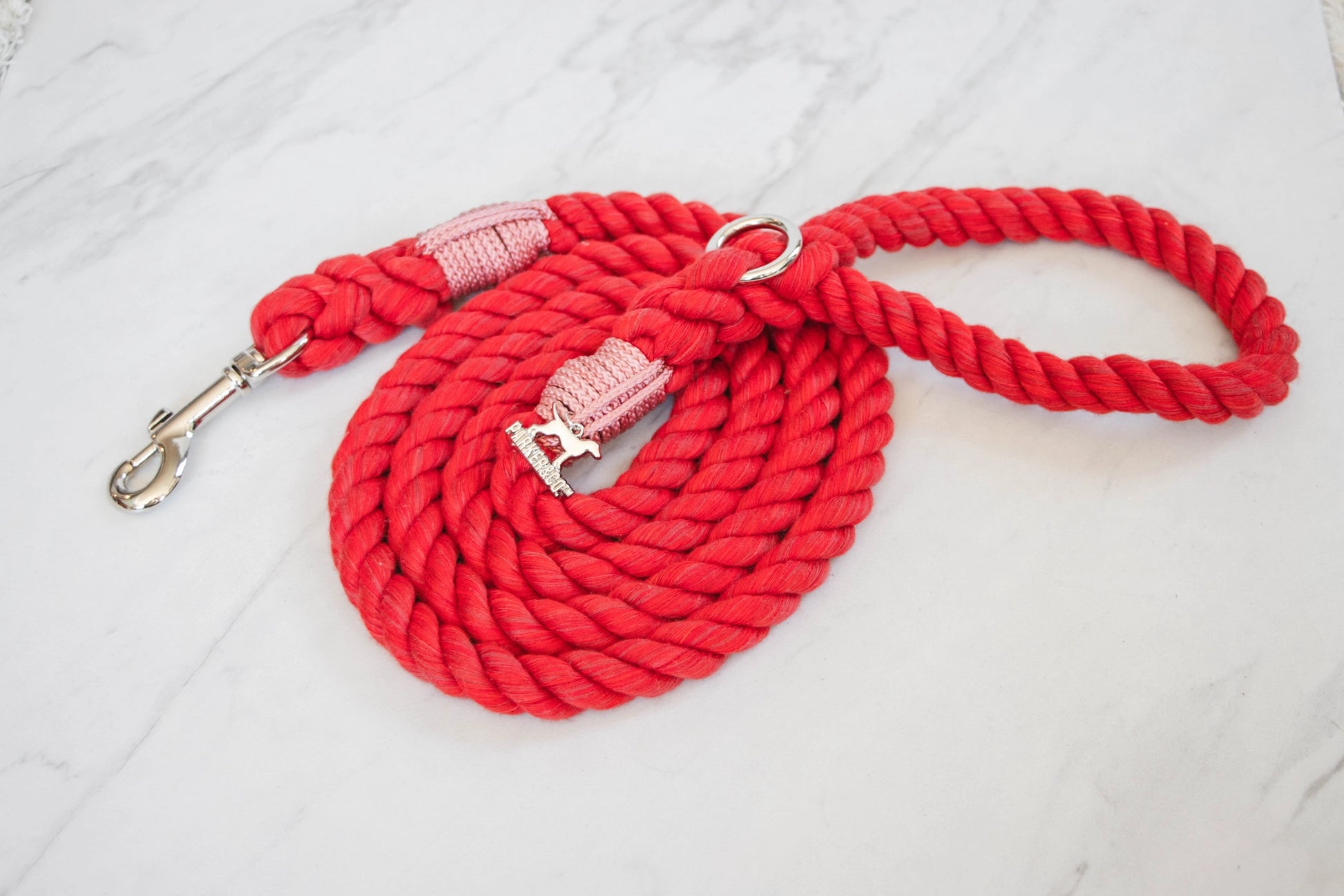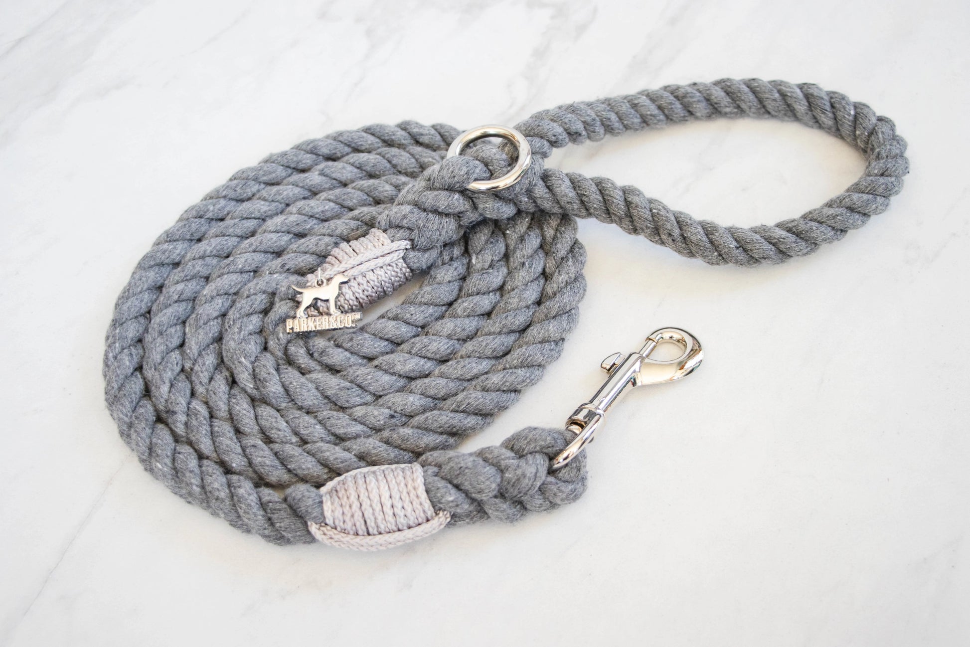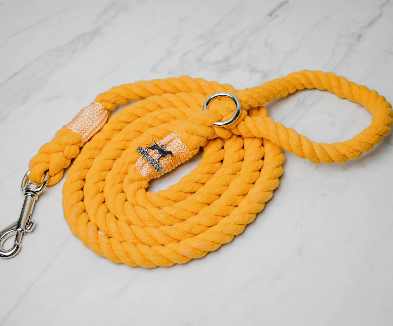 In North America, 10 million tonnes of used textile waste is sent to the landfill each year. The rope used in these leashes is made by upcycling that waste into soft cotton yarns. No dyes, water, or chemical products are used to colour match the upcycled yarns. Handle Rope: 100% natural upcycled cotton (break strength 2155 lbs). These Cotton Rope Leashes are renewable, long-lasting, and eco-friendly!