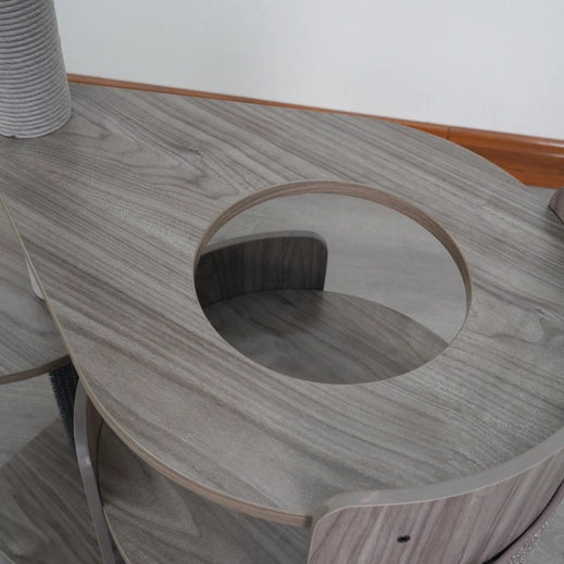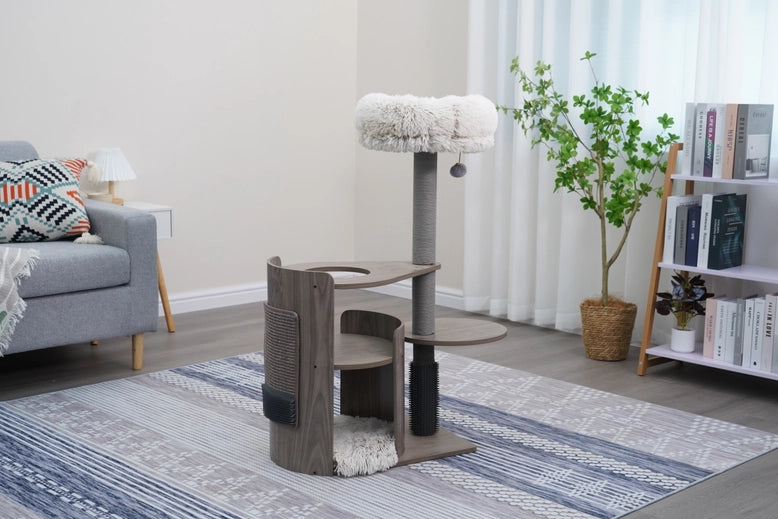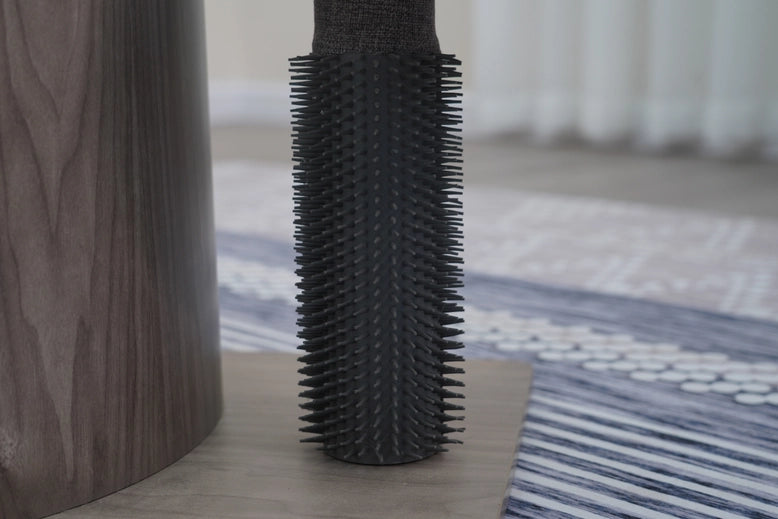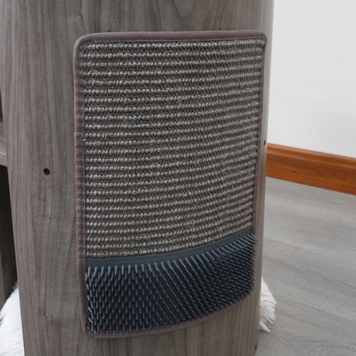 Cullen is our Mid-Century Arc multi-activity cat tower your cat is going to fall in love with. This medium-sized cat tower offers 5-levels to keep your cat entertained and active. Featuring two plush faux fur shag beds, your cat can nap in comfort, and with two 100% natural sisal scratching posts and sisal carpets, your cat has options to choose from. It also comes with a large sisal scratcher mat so when you want to switch it up you can just attach it to the front curved wooden plate. Cullen comes with two rubber groomers, so your cat can massage those hard-to-reach spots