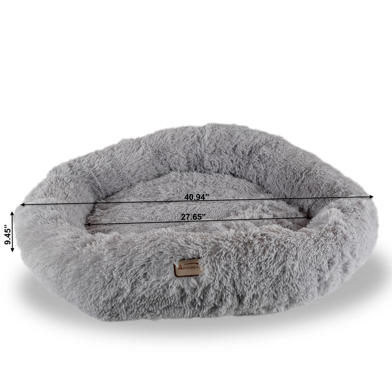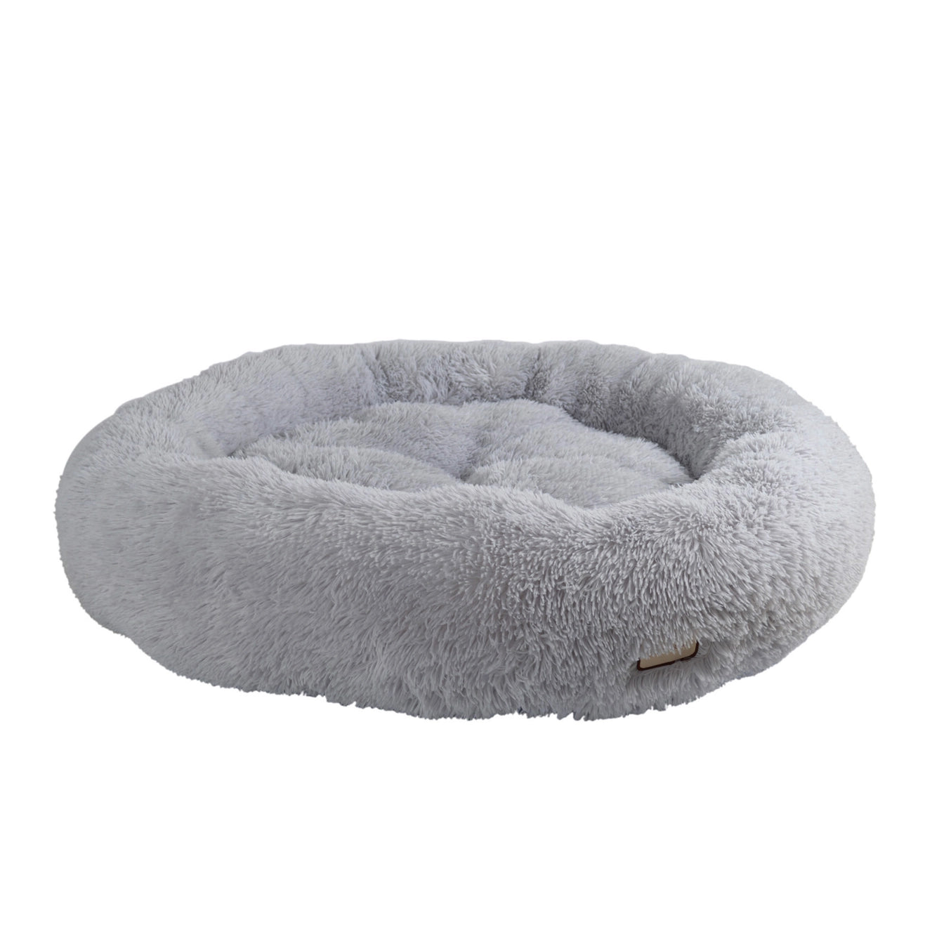 Bolstered donut shape pet bed, cradles and cushions pets, promoting comfort and security. It provides a super cozy and insulating burrowing nest for dogs and cats. Elevated edges create a sense of security and provide head and neck support, ultra-soft fillers provide maximum comfort. Color: Light Grey.