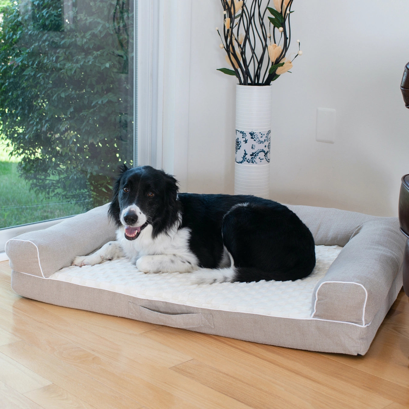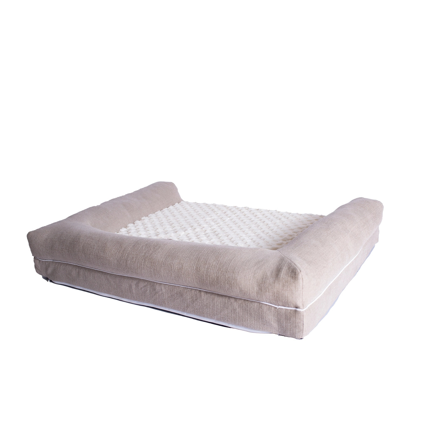 This medium bolstered pet bed comes complete with a 3.1"-thick memory foam mattress for the ultimate comfort of your canine. Offered in a ivory and beige color combination, this dog bed has a cover that is machine washable. Pet owners will appreciate the bed's durable upholstery.