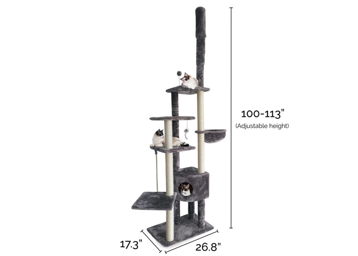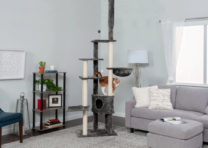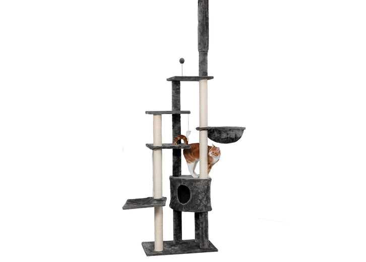 Your cat will love this Tiger Tough Skyscraper Playground cat tree! There is an adjustable spring at the top which braces it to your ceiling which makes this cat furniture secure and tip-free. The skyscraper playground also features an enclosed cat condo, cat shelves in different shapes and sizes, soft bowl hammock cat bed, sisal rope-covered scratching posts, springy-wand ball cat toys, hanging sisal rope and mouse toys!