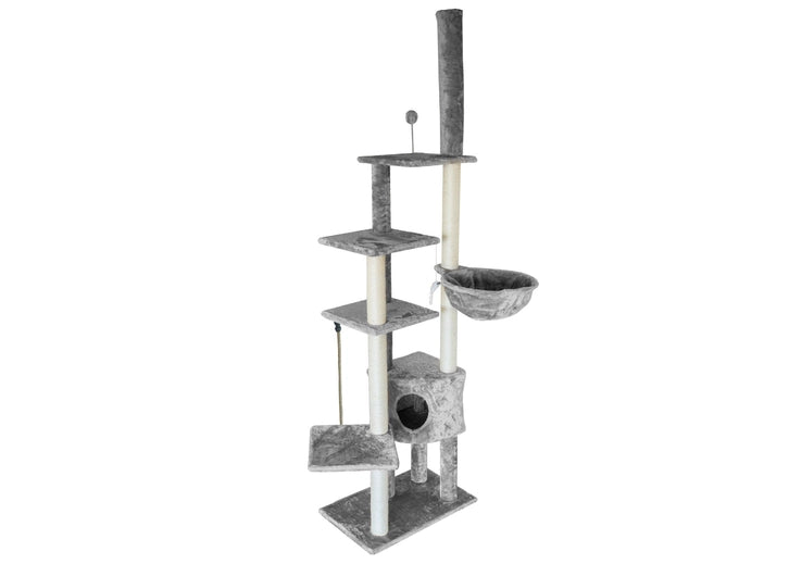This tall cat tower reaches over 8 feet tall, and has multiple levels of enjoyment! Whether your kitty is on the lower level playing with the mouse toy dangling from sisal rope, relaxing in privacy in the enclosed cat house, laying playfully in the hammock, or stretching on an upper cat perch playing with the spring-y ball wand toy, you will know that your cat is happy and safe.