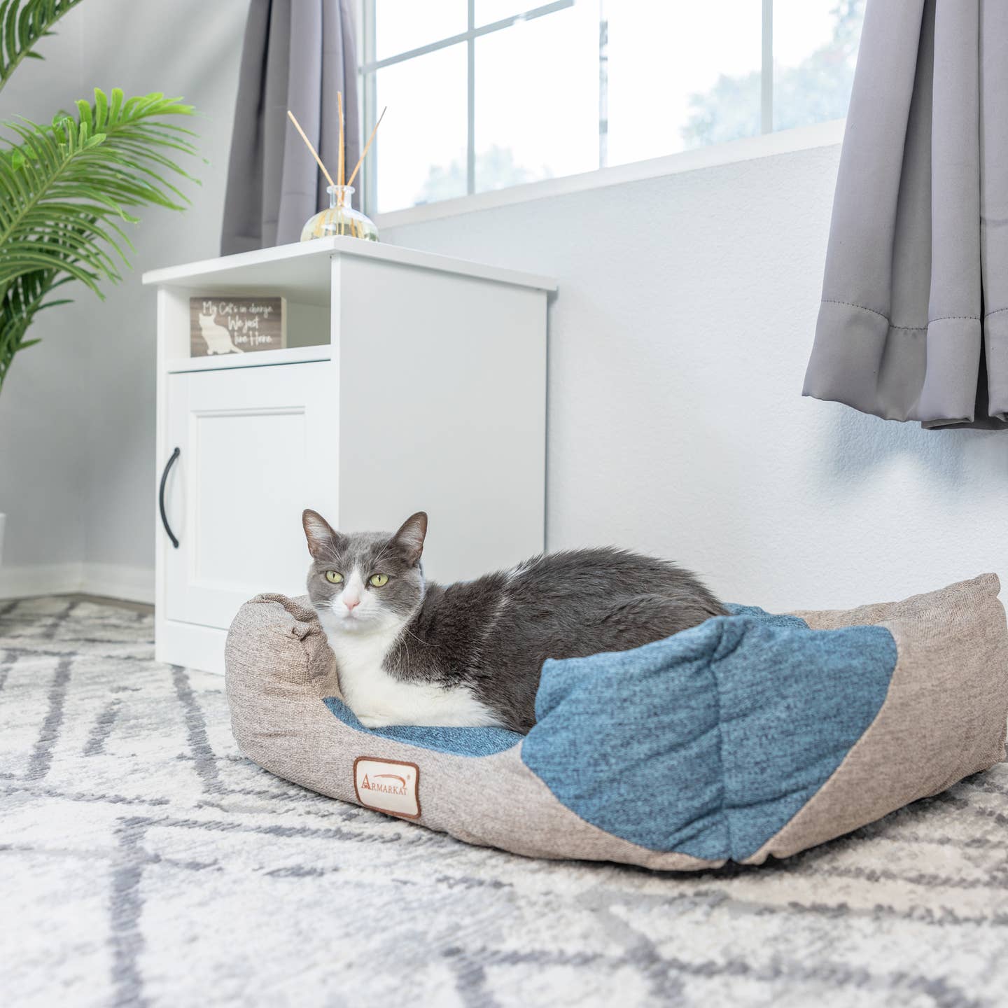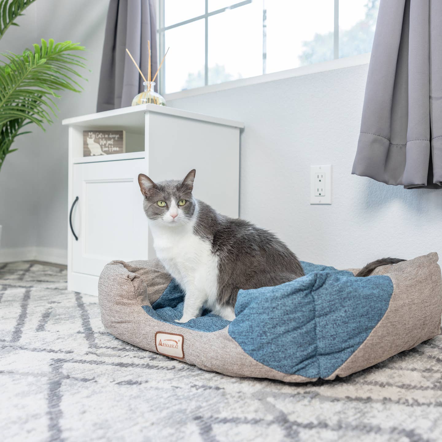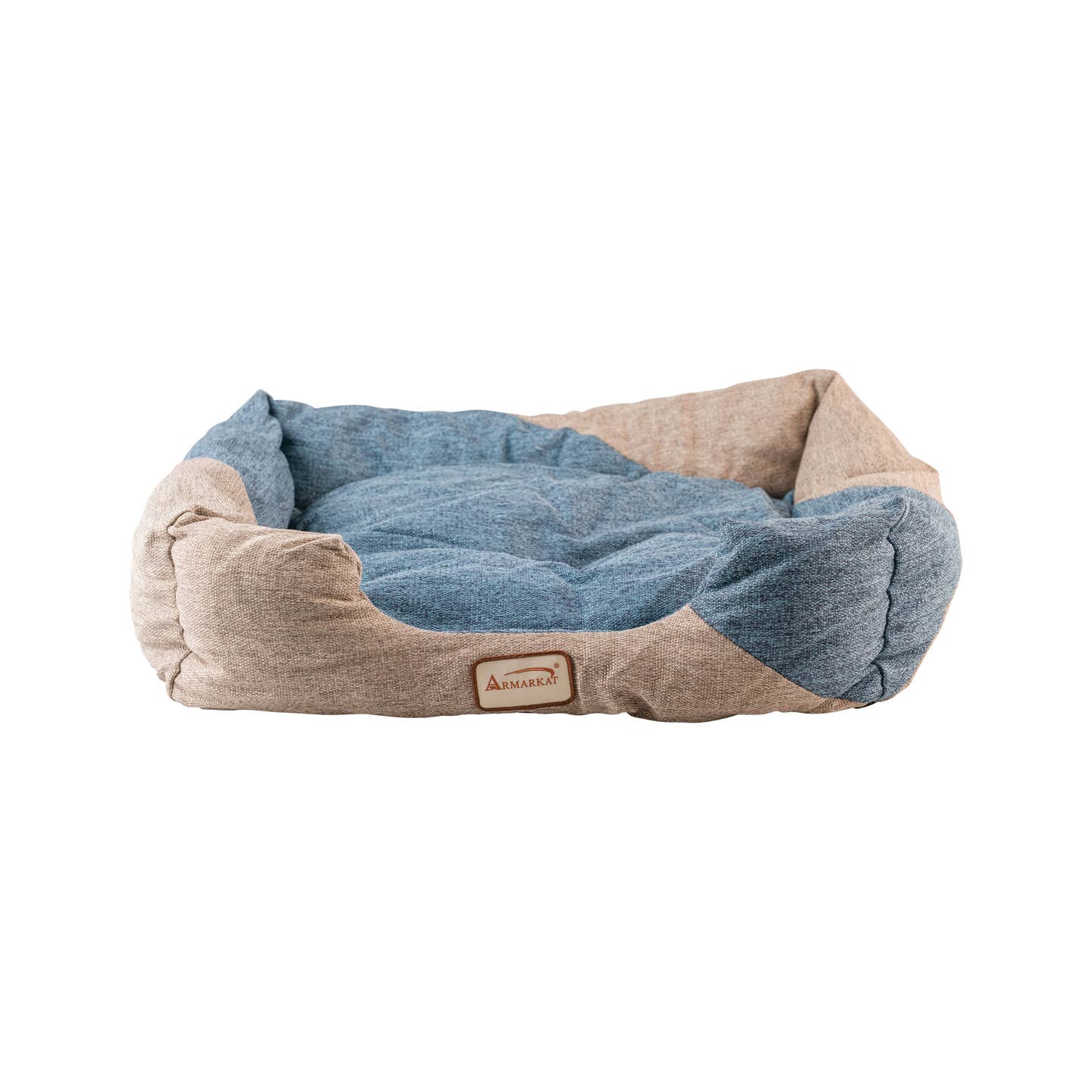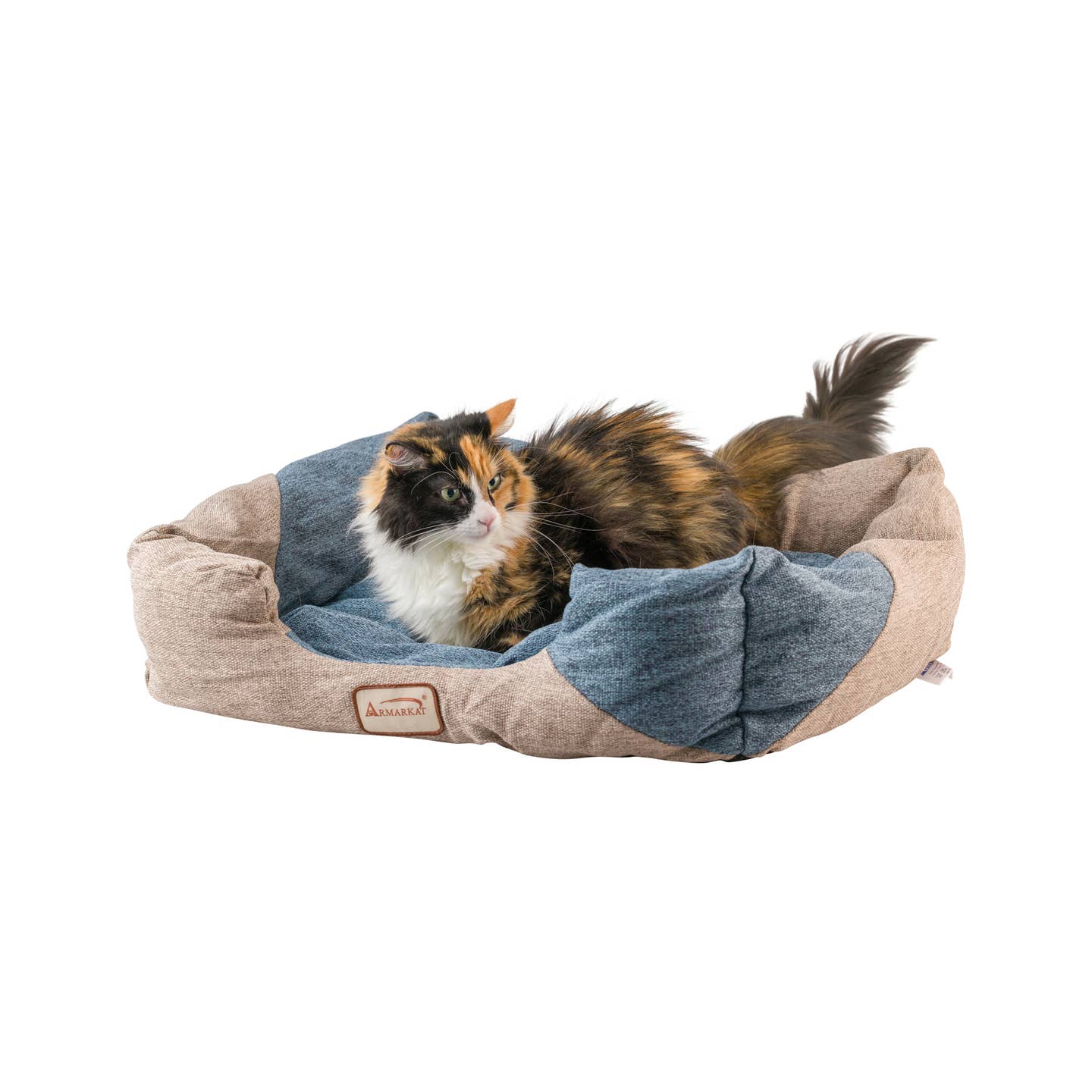 Your feline will enjoy the new Model C47 Armarkat cat bed. Offered in a cornflower blue and beige color combination, the bolstered cat bed is filled with extra-thick, 100% polyfill for maximum comfort. The bed is covered in a soft upholstery. The waterproof base will not skid around the house. Machine washable.