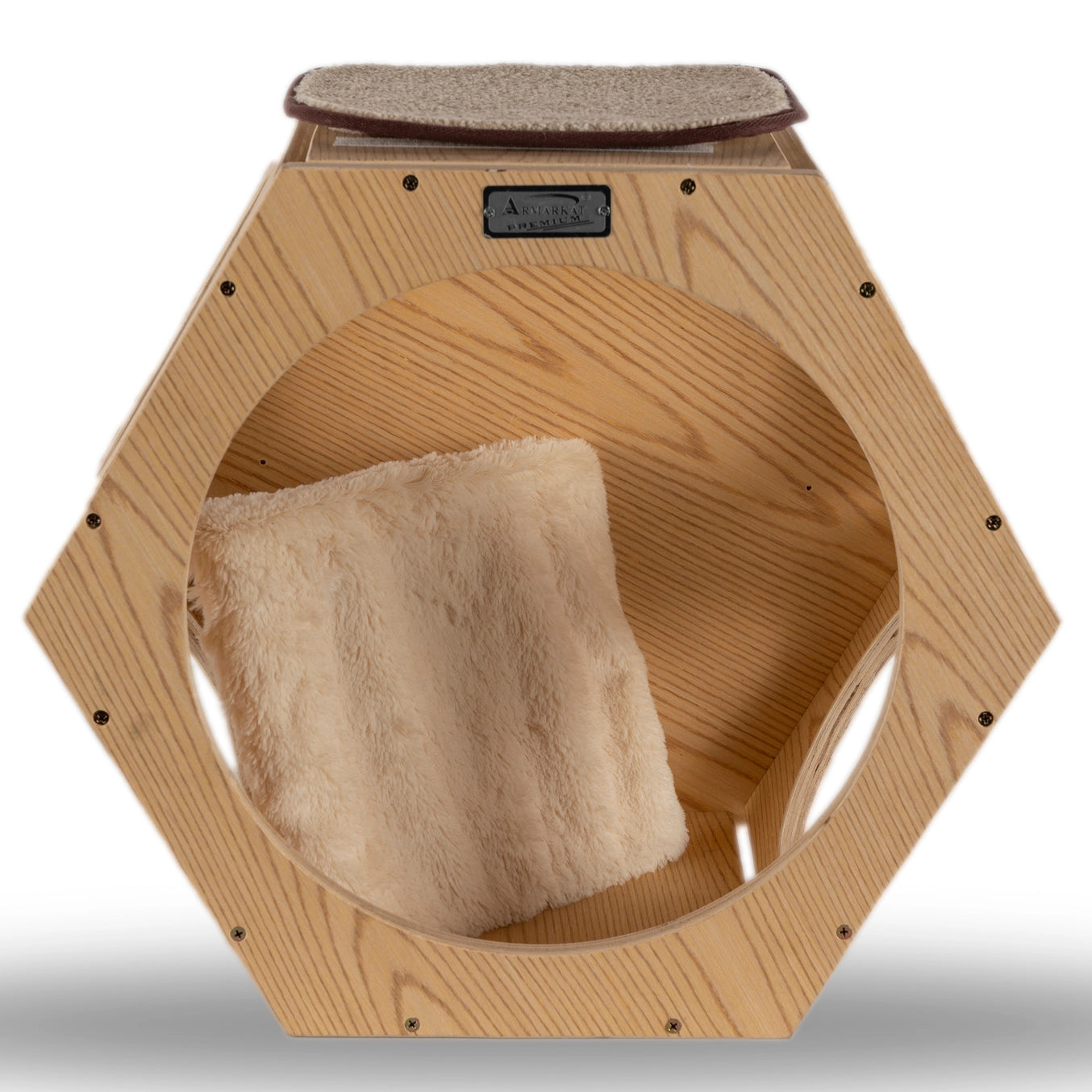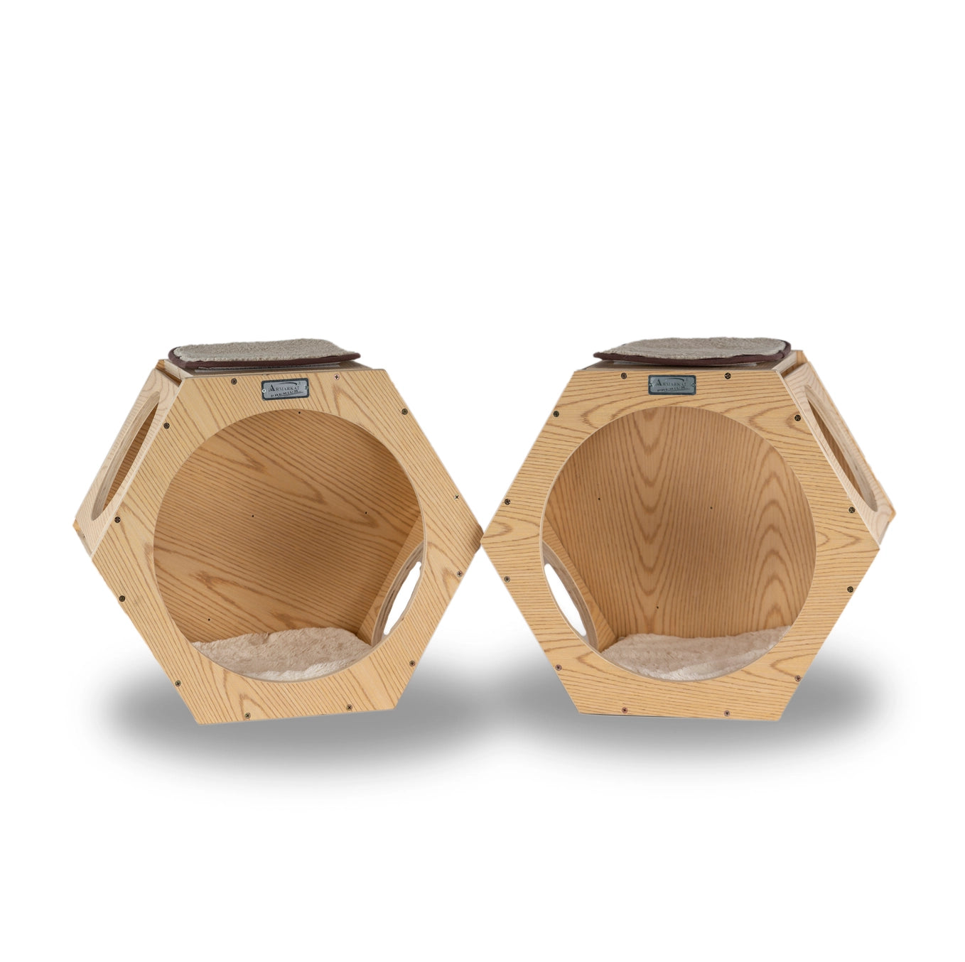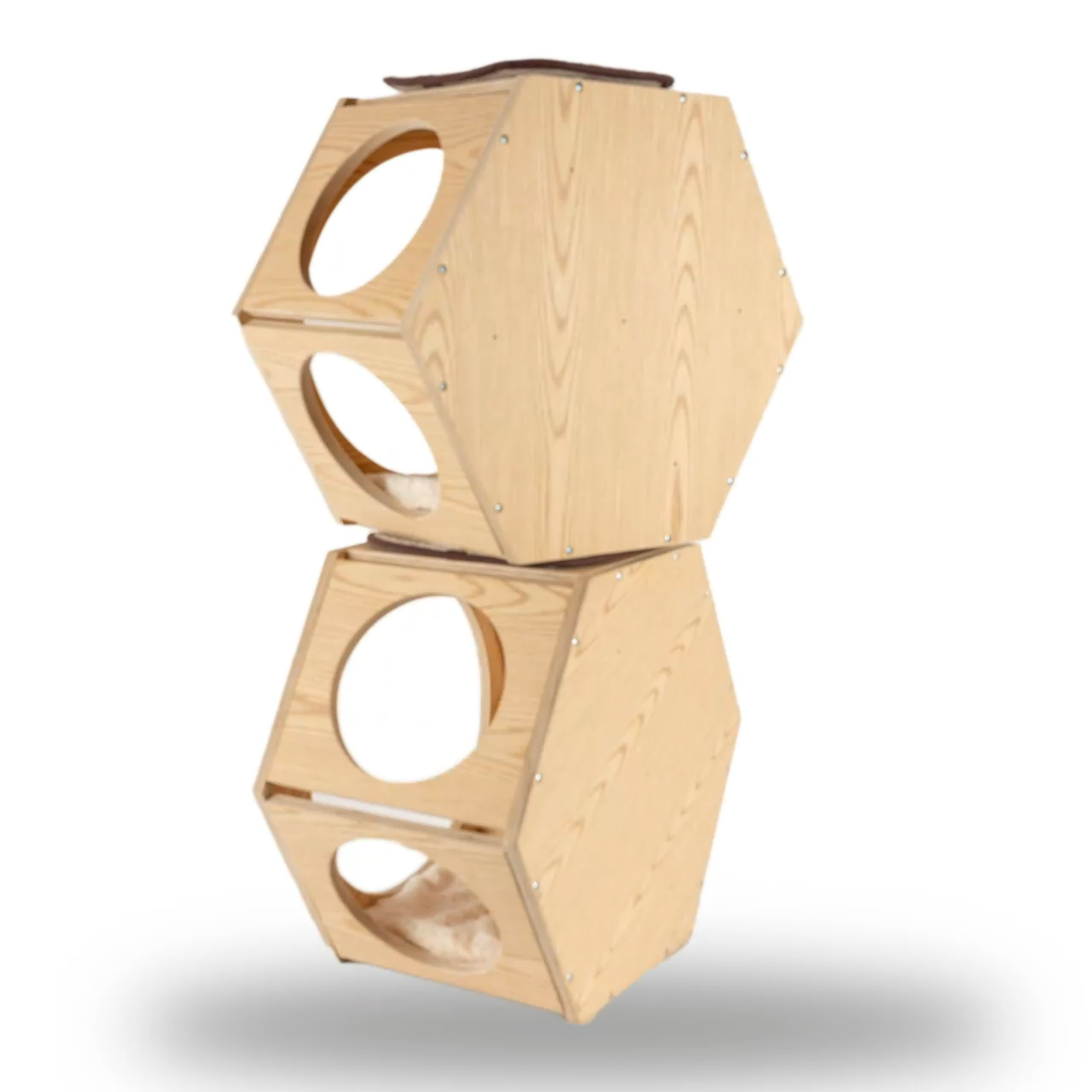 Cat lovers can create levels of activity for their pets. This hexagon shaped condo set is perfect for homes with limited space. It has 4 openings, so cats can walk through or see through from the inside.
