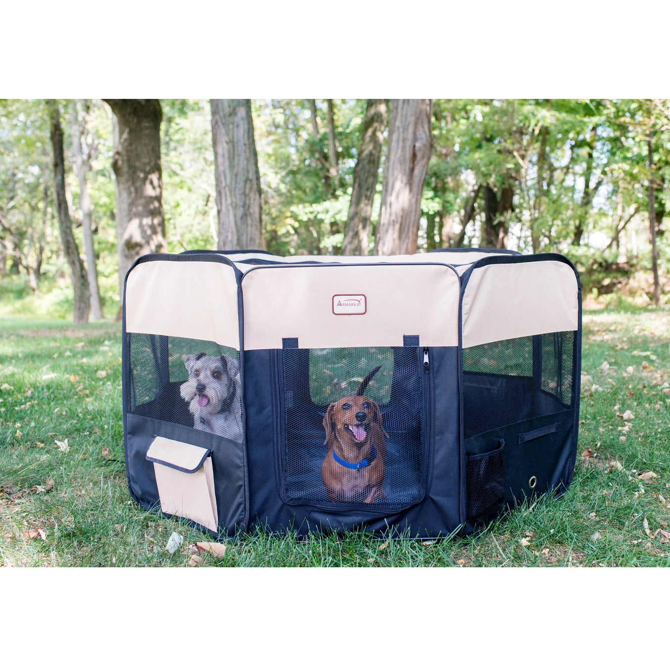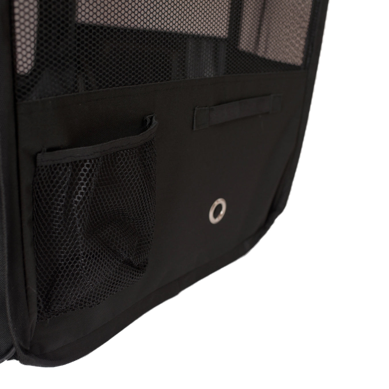 This XL portable playpen is perfect for kittens, puppies, or a group of playful Chihuahuas. Available in a stunning color combination of black and beige.It has a zip-off top and outside pocket for treats and toys. model PP001B is water resistant and is constructed of extra-strong polyester fabric with mesh vents for visibility and air. With a net weight of 7.7 lbs., the portable playpen is lightweight for outside or indoors, but tough enough for travel. Equipped with space for pet care accessories like water bottle holder, water dispensing window, and exterior pocket to keep pet treats like a chewable or toys. Water-resistant material, easy to clean. Easily Set up or flat folded and kept inside a small travel bag or backpack. Great for traveling, riding, walking, sightseeing, camping, hiking and more outdoor activities.
